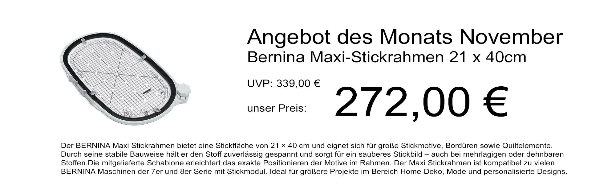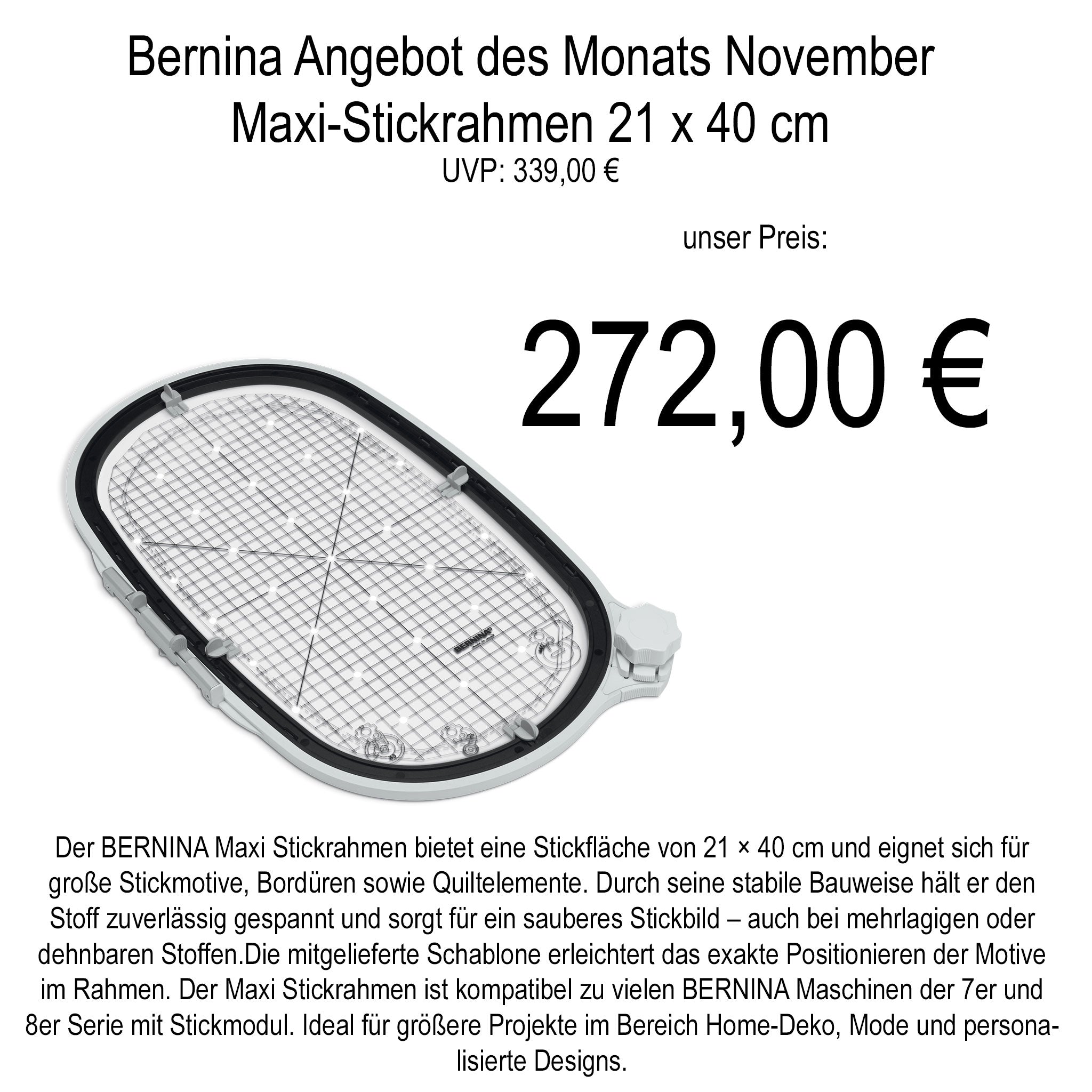 Der BERNINA Maxi Stickrahmen bietet eine Stickfläche von 21 × 40 cm und eignet sich für große Stickmotive, Bordüren sowie Quiltelemente. Durch seine stabile Bauweise hält er den Stoff zuverlässig gespannt und sorgt für ein sauberes Stickbild – auch bei mehrlagigen oder dehnbaren Stoffen.Die mitgelieferte Schablone erleichtert das exakte Positionieren der Motive im Rahmen. Der Maxi Stickrahmen ist kompatibel zu vielen BERNINA Maschinen der 7er und 8er Serie mit Stickmodul. Ideal für größere Projekte im Bereich Home-Deko, Mode und personalisierte Designs.